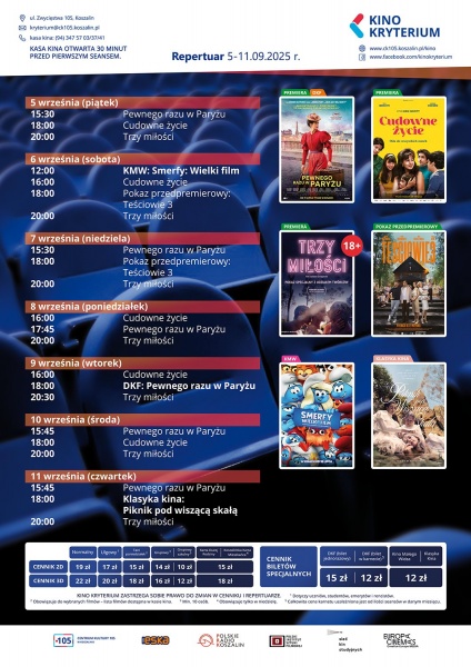 Kino Kryterium zaprasza. Cennik: Bilety 2D poniedziałek- niedziela: 19zł – normalny, 17zł – ulgowy, 14 zł – grupowy; 15zł - Tani Poniedziałek, Koszalińska Karta Mieszkańca (honorowana w niedziele); Bezpieczne Wakacje: 2 zł – dzieci z Koszalina, 10 zł – pozostali.