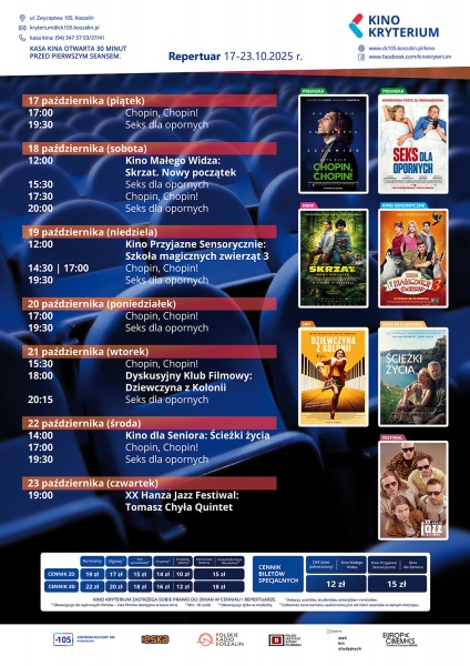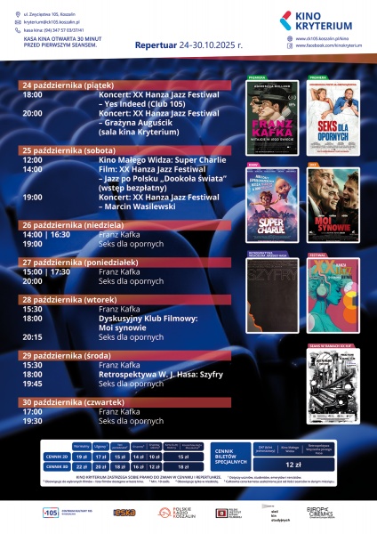 Cennik: Bilety 2D poniedziałek - niedziela: 19zł – normalny, 17zł – ulgowy, 14 zł – grupowy; 15zł - Tani Poniedziałek, Koszalińska Karta Mieszkańca (honorowana w niedziele), Dyskusyjny Klub Filmowy, Kino Przyjazne Sensorycznie, Kino dla Seniora; 12 zł – Kino Małego Widza, Retrospektywa Wojciecha Jerzego Hasa.