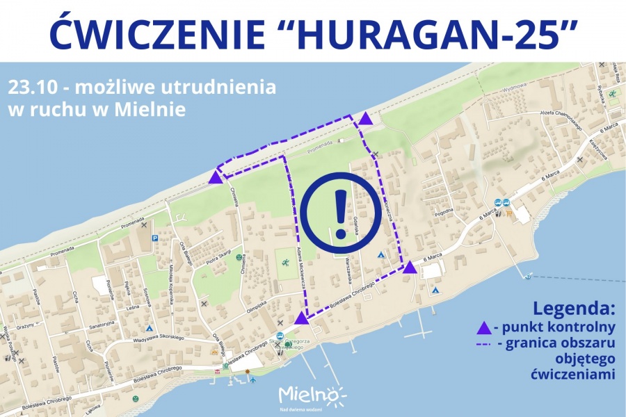 W czwartek, 23 października 2025 r., w godzinach 7:30–12:30, na terenie Mielna odbędą się powiatowe ćwiczenia z zakresu zarządzania kryzysowego pod kryptonimem „Huragan-25”. W tym czasie na ulicach miasta, promenadzie oraz plaży będzie można spotkać liczne służby – straż pożarną, policję, wojsko i przedstawicieli innych instytucji odpowiedzialnych za bezpieczeństwo publiczne.