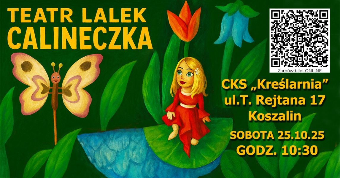 Zapraszamy wszystkich najmłodszych widzów wraz z rodzicami na wyjątkowe widowisko – bajkę „Calineczka” w wykonaniu Teatru Lalek „Frajda” z Koszalina. Sobota, 25 października 2025 r. Centrum Kultury Studenckiej „Kreślarnia”, ul. T. Rejtana 17, Koszalin