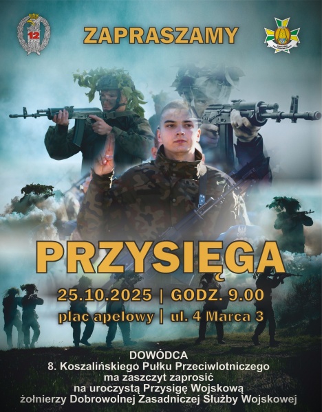 Dowódca 8. Koszalińskiego Pułku Przeciwlotniczego ma zaszczyt zaprosić wszystkich mieszkańców regionu, rodziny żołnierzy oraz sympatyków Wojska Polskiego na uroczystą Przysięgę Wojskową żołnierzy Dobrowolnej Zasadniczej Służby Wojskowej. Sobota, 25 października 2025 r. Godzina 9:00, Plac apelowy – ul. 4 Marca 3, Koszalin