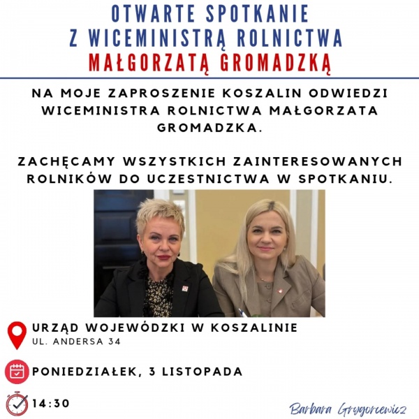 Na zaproszenie posłanki Barbary Grygorcewicz odbędzie się otwarte spotkanie z nową wiceministrą rolnictwa Małgorzatą Gromadzką. Wydarzenie zaplanowano na poniedziałek, 3 listopada 2025 r., o godzinie 14:30, w koszalińskim Urzędzie Wojewódzkim przy ul. Andersa 34.