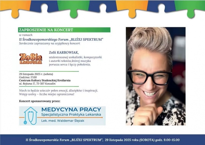Już 29 listopada 2025 roku mieszkańców regionu czeka wyjątkowe muzyczne wydarzenie. Tuż po zakończeniu II Środkowopomorskiego Forum „Bliżej Spektrum” odbędzie się koncert utalentowanej wokalistki, kompozytorki i autorki tekstów ZoSi Karbowiak. Artystka znana jest z niezwykłej wrażliwości muzycznej i energii, która porusza słuchaczy niezależnie od wieku – jej twórczość łączy pokolenia i emocje. Koncert zaplanowano na godzinę 17:00, w Centrum Kultury Studenckiej Kreślarnia przy ul. Rejtana 17 w Koszalinie.