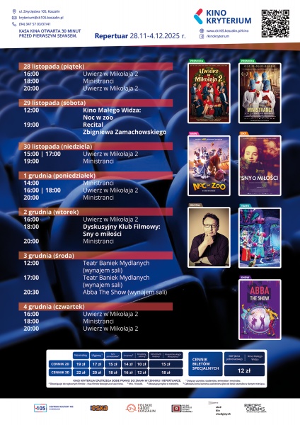 Cennik: Bilety 2D poniedziałek - niedziela: 19zł – normalny, 17zł – ulgowy, 14 zł – grupowy; 15zł - Tani Poniedziałek, Koszalińska Karta Mieszkańca (honorowana w niedziele), 12 zł - Dyskusyjny Klub Filmowy.