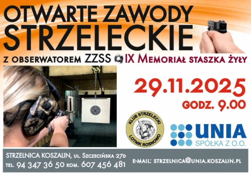 Strzelnica UNIA Koszalin zaprasza wszystkich miłośników sportu strzeleckiego na Zawody Strzeleckie IX Memoriału Staszka Żyły, które odbędą się 29 listopada. Wydarzenie, organizowane z udziałem obserwatora Zachodniopomorskiego Związku Strzelectwa Sportowego, stanowi jedno z najważniejszych cyklicznych spotkań strzeleckich w regionie.