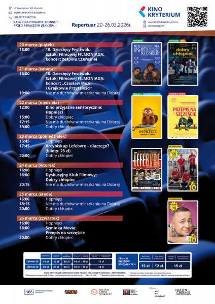Cennik: Bilety 2D poniedziałek - niedziela: 19zł – normalny, 17zł – ulgowy, 14 zł – grupowy; 15zł - Tani Poniedziałek, Koszalińska Karta Mieszkańca (honorowana w niedziele), Dyskusyjny Klub Filmowy, Szminka Movie, Kino przyjazne sensorycznie