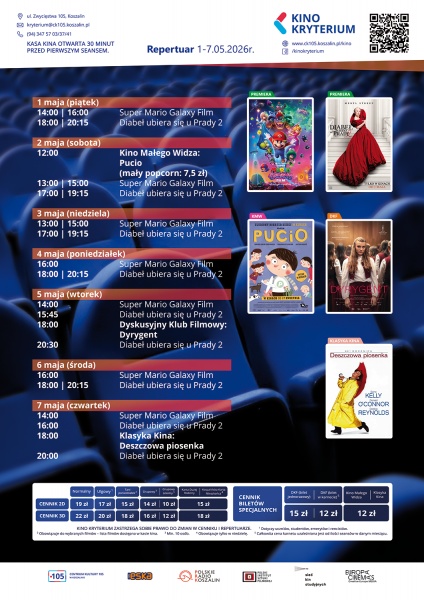 Cennik: Bilety 2D poniedziałek - niedziela: 19zł – normalny, 17zł – ulgowy, 14 zł – grupowy; 15zł - Tani Poniedziałek, Koszalińska Karta Mieszkańca (honorowana w niedziele), Dyskusyjny Klub Filmowy; 12zł – Kino Małego Widza.