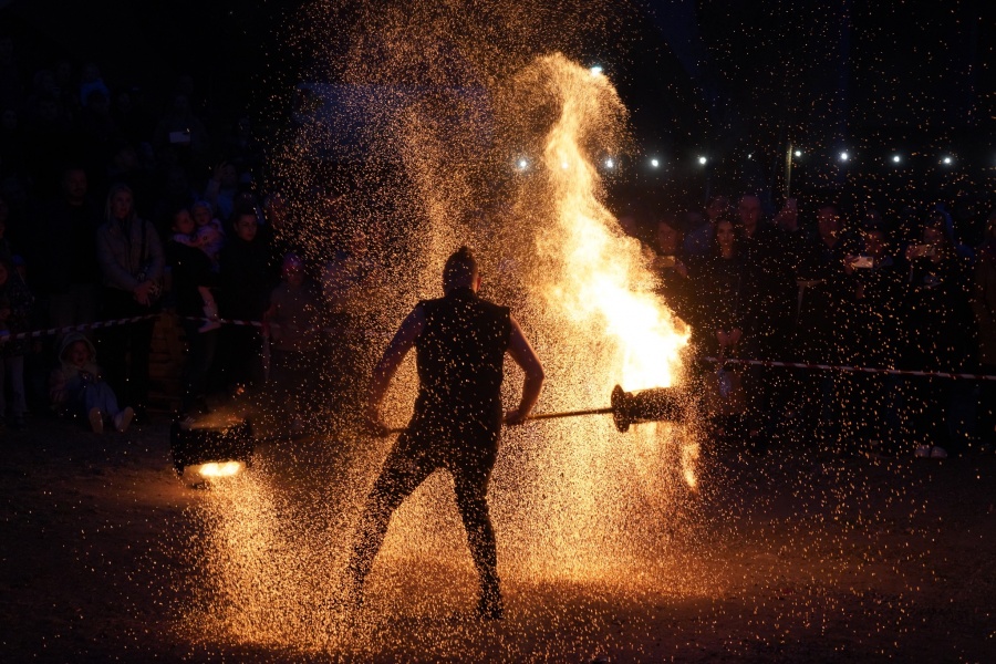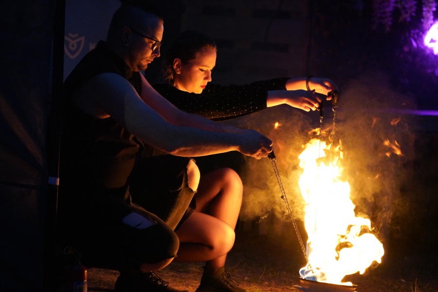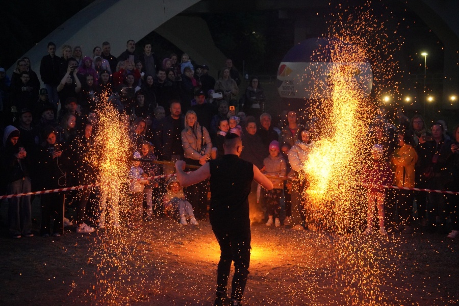 Spektakl JumpFire Fireshow to kwintesencja teatralnego ognia – żonglerka z płomiennymi pałkami, kłęby dymu i precyzyjna choreografia. Publiczność nie tylko obserwowała, ale niemal uczestniczyła w ogniowej mitologii: pierwsze iskry rodziły napięcie, a każdy wybuch światła budził wspólny okrzyk zachwytu. Artystom udało się to, co w plenerze najtrudniejsze: skupić uwagę, wywołać ciszę i w jednej chwili przywołać gotowość do braw.