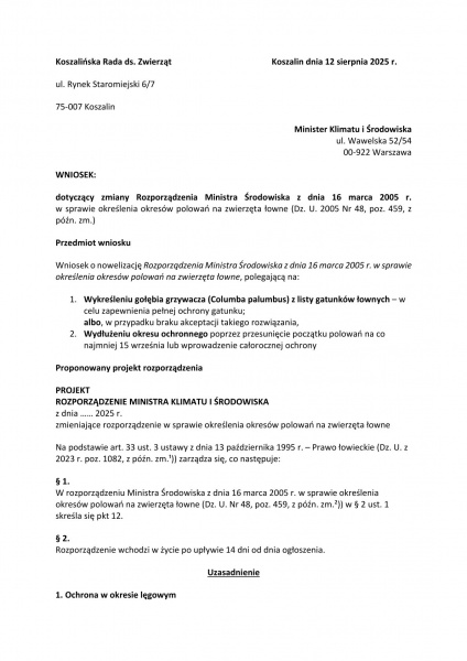 Całkowite wykreślenie gołębia grzywacza (Columba palumbus) z listy gatunków łownych, co zapewniłoby gatunkowi pełną ochronę.