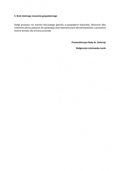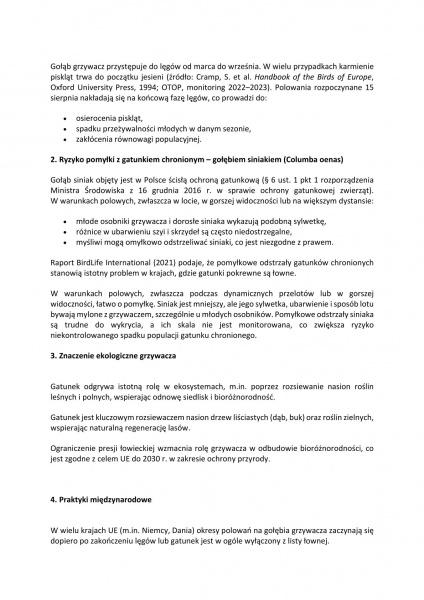 Z danych przyrodniczych przytoczonych przez Radę wynika, że gołąb grzywacz przystępuje do lęgów od marca do września, a w wielu przypadkach karmienie piskląt trwa aż do początku jesieni. Polowania rozpoczynane 15 sierpnia nakładają się na końcową fazę lęgów, co prowadzi do: osierocenia piskląt, spadku przeżywalności młodych w danym sezonie i zaburzenia równowagi populacyjnej.