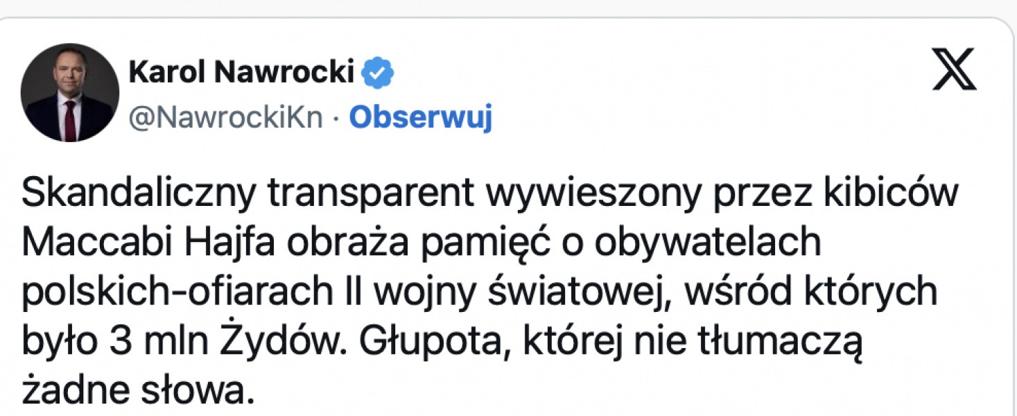 Na sprawę szybko zareagował prezydent Karol Nawrocki, który ostro potępił akcję kibiców. – „Transparent jest skandaliczny. To obraża pamięć o obywatelach polskich-ofiarach II wojny światowej, wśród których było 3 mln Żydów” – napisał Nawrocki w mediach społecznościowych.