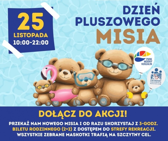 W godzinach 10:00–22:00, każdy, kto podaruje pluszowego misia, otrzyma rodzinny bilet (max 2+2) do strefy rekreacji Parku Wodnego. Tak więc: dajesz misia → dostajesz basen. Trudno o lepszy kurs wymiany dóbr.
