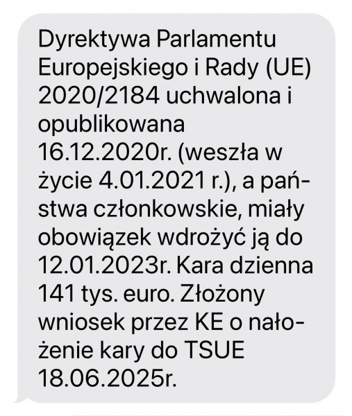 W swojej narracji senator podkreślał też polityczną ironię sytuacji: dyrektywa UE została wynegocjowana za rządów Mateusza Morawieckiego, a obowiązek wdrożenia spoczywał na ówczesnym rządzie. Ostatecznie – z opóźnieniem – miały to robić kolejne władze, tymczasem prezydent zawetował ustawę wdrażającą przepisy.