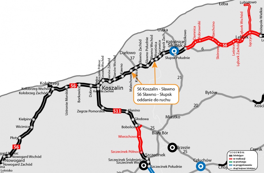 Odcinki Koszalin–Słupsk dołączają do wcześniej oddanych fragmentów S6 w woj. zachodniopomorskim – od rejonu Goleniowa do Sianowa – oraz do działającego już od kilku lat odcinka Bożepole Wielkie – Gdynia (woj. pomorskie). Do pełnego połączenia pozostaje jeszcze ostatnie 62 km od Słupska do istniejącej Trasy Kaszubskiej w kierunku Gdyni, które – według zapowiedzi – mają być gotowe w przyszłym roku.