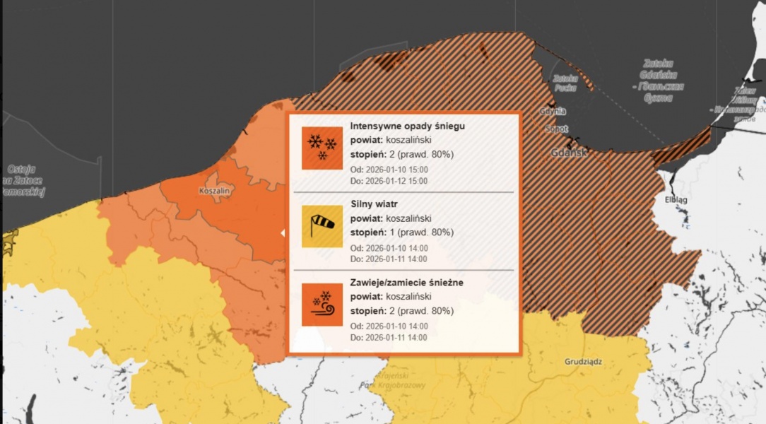 Prognozy IMGW na weekend 10–11 stycznia oraz noc z 11 na 12 stycznia 2026 r. wskazują na utrzymanie prawdziwie zimowej aury w całym kraju: dominować będzie duże zachmurzenie, okresowe opady śniegu, a miejscami także silny wiatr powodujący zawieje i zamiecie. Największe natężenie zjawisk ma występować na Pomorzu (w tym na Kaszubach i na Pomorzu Wschodnim) oraz w obszarach górskich.